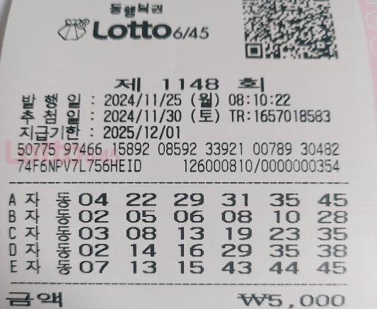 로또 1148회 자동 월요일 용지 공유합니다. 제가 가는 곳은 아침 8시에 오픈을 합니다. 시간이 되는 한 8 시대에 맞게 자동 용지를 뽑아 공유할 예정입니다. 분석 잘하셔서 1148회 로또 대박 나시길 바랍니다.
