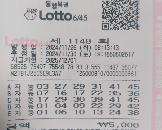 | 로또 1148회 자동 금요일 용지 공유 (0) | 2024.11.29 |