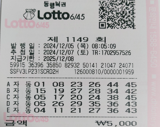 로또 1149회 자동 목요일 용지 공유합니다. 제 용지가 가짜가 아닐까 의심하시는 분들이 있어 아래에 용지 인증 사진 올립니다. 아침 같은 시간대에 나가 5분 거리에 있는 복권방에서 구입하는 것이니 안심하고 보셔도 됩니다. 로또 1149회 자동분석 잘하시어 대박 나시길 바랍니다.
