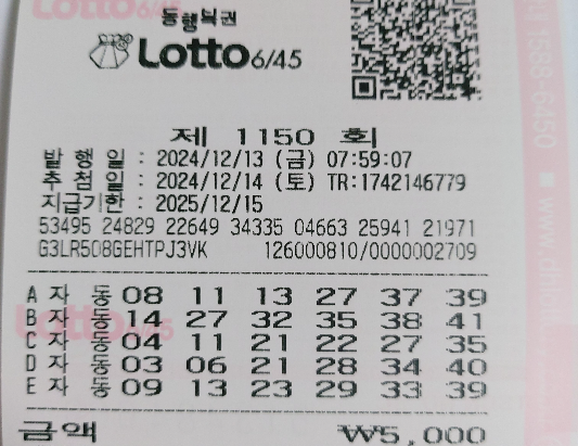 | 로또 1150회 자동 수요일 용지 공유 (0) | 2024.12.11 |