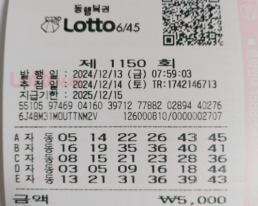 로또 1151회 일요일 첫자동 용지 공유 (0) | 2024.12.15 |