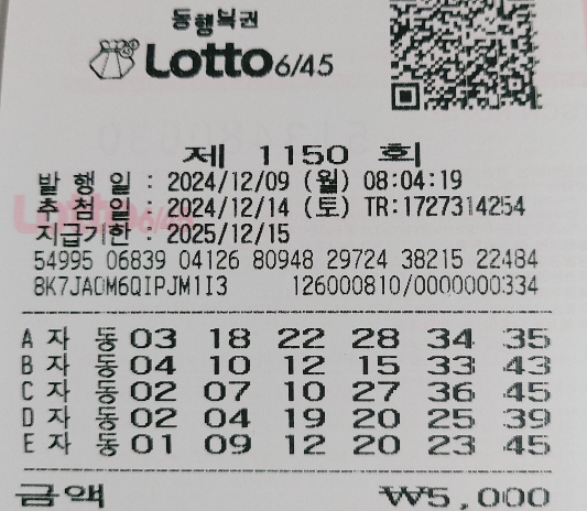 | 로또 1150회 일요일 첫자동 용지 공유 (0) | 2024.12.08 |