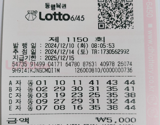 | 로또 1150회 일요일 첫자동 용지 공유 (0) | 2024.12.08 |