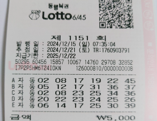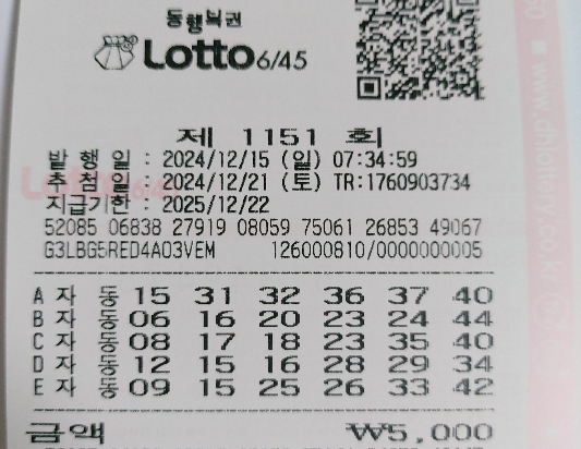 로또 1151회 일요일 첫자동 용지 공유합니다. 새로운 한 주가 시작되었습니다. 지난 회차의 아쉬움은 뒤로하고 1151회 자동분석 잘하시어 좋은 결과 있으시길 바랍니다.