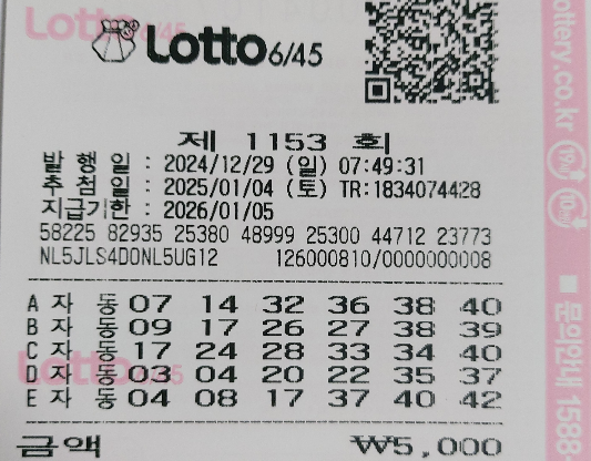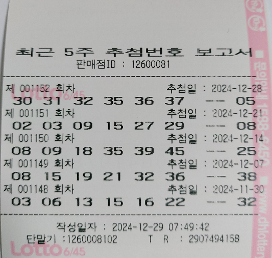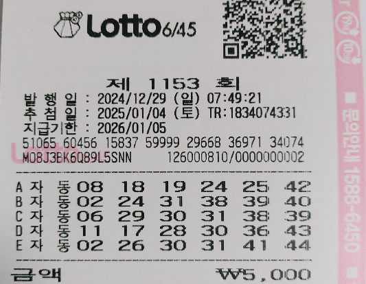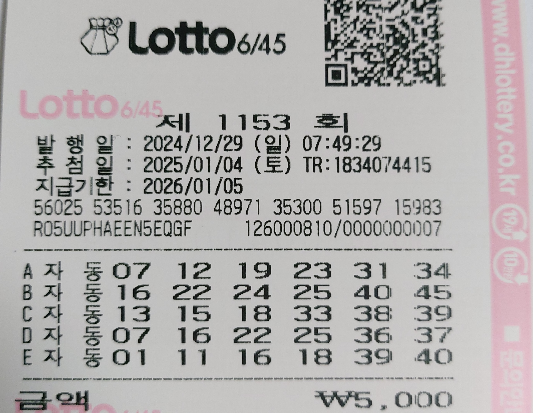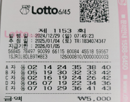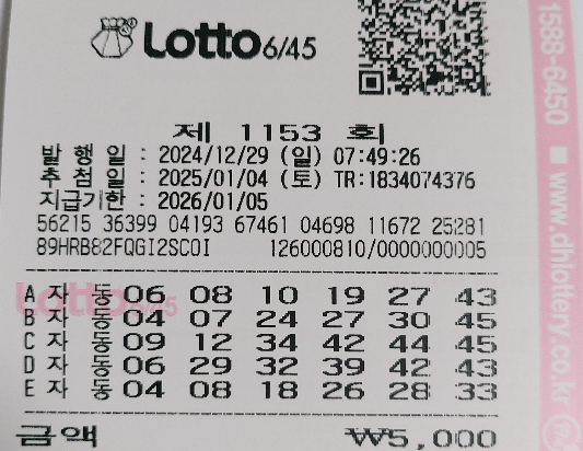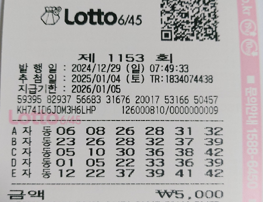 • 로또 1153회 자동 화요일 용지 공유 2024.12.31