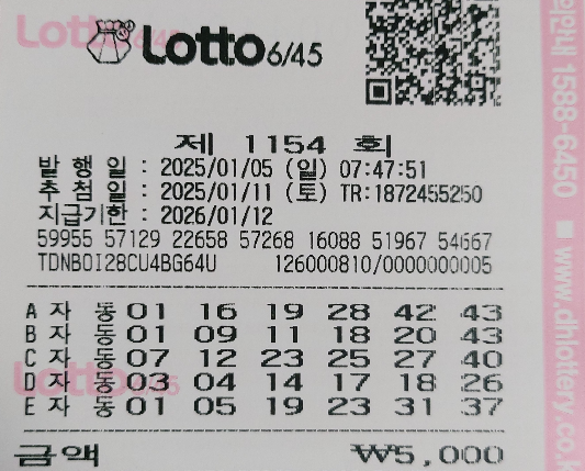 안녕하세요! 오늘은 로또 1154회 일요일 첫자동 용지를 여러분과 공유 하고자 합니다. 매주 많은 분들이 로또를 통해 꿈과 희망을 키워가고 있으며, 특히 자동으로 선택된 번호는 때때로 놀라운 행운을 가져다주기도 합니다.