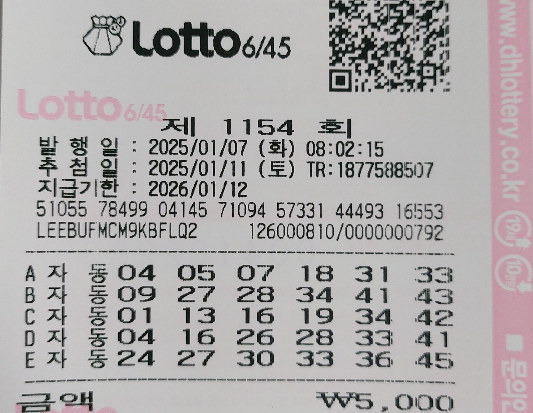 안녕하세요! 오늘은 로또 1154회 자동 화요일 용지를 공유하고자 합니다. 매주 로또는 많은 분들께 꿈과 희망을 주며, 자동으로 선택된 번호가 때때로 뜻밖의 행운을 가져다주는 경우가 많습니다.