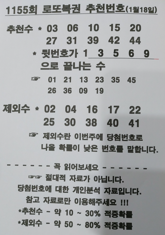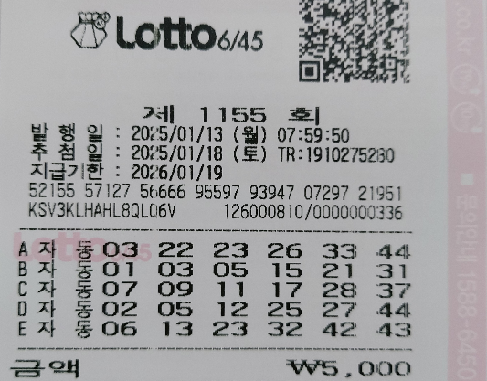 • 로또 1155회 일요일 첫자동 용지 공유 2025.01.12
