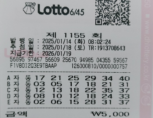 • 로또 1155회 일요일 첫자동 용지 공유 2025.01.12