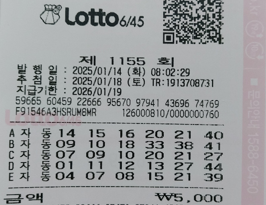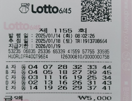 • 로또 1155회 자동 목요일 용지 공유 2025.01.16