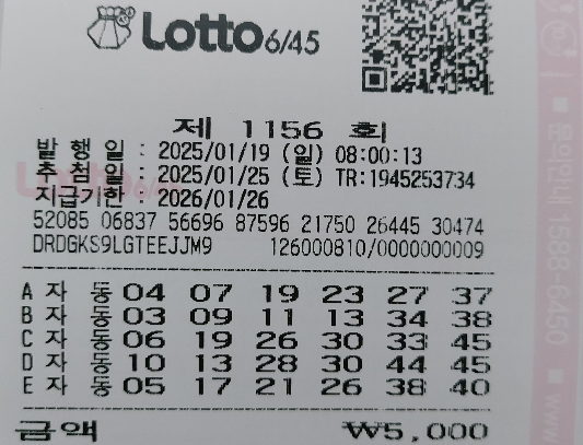 로또 1156회 첫자동 일요일 용지 10장(1-10) 공유