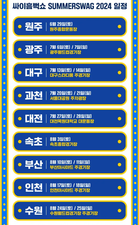 지역 일정 장소 원주 6월 29일(토) 원주종합운동장 광주 7월 6일(토) / 7일(일) 광주월드컵경기장 대구 7월 13일(토) / 14일(일) 대구스타디움